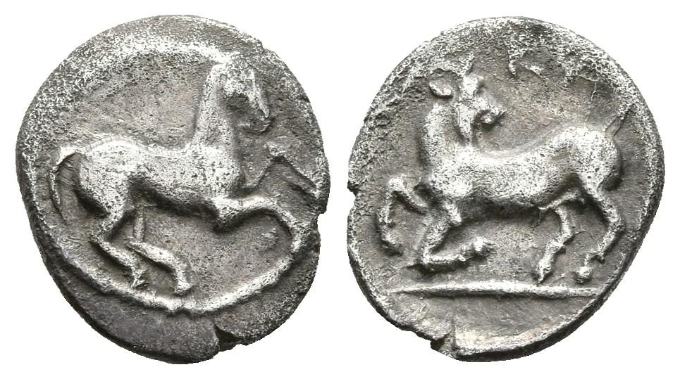 CILICIA, Kelenderis. Obolo. 425-400 a.C. A/ Caballo galopando a derecha. R/ Cabra arrodillándose a izquierda con cabeza vuelta, encima KE. SNG France 116-117; SNG Levante 29. Ar. 0,80g. MBC+.