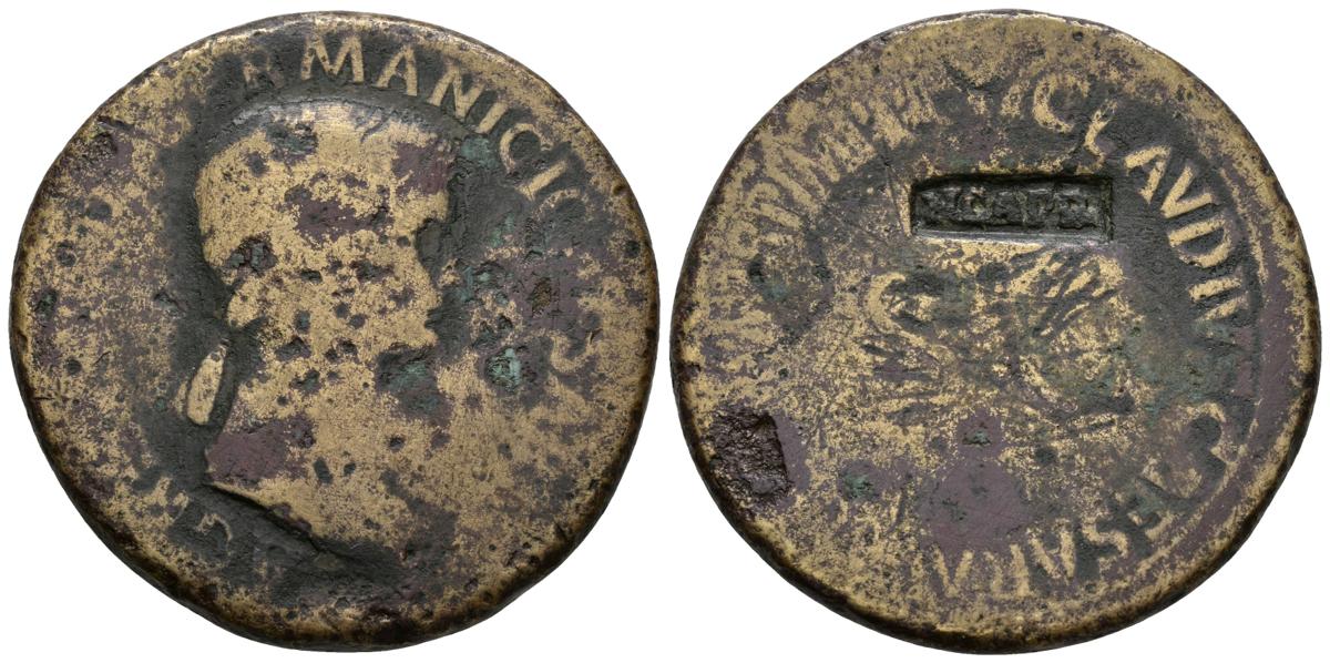 AGRIPPINA I. Sestercio. 41-54 d.C. Roma. A/ Busto drapeado a derecha. AGRIPPINA M F GERMANICI CAESARIS. R/ S-C central y alrededor TI CLAVDIVS CAESAR AVG GERM P M TR P IMP P P. RIC 102 (Claudius). Ae. 25,89g. Contramarca NCAPR (Nummus Caesare Augustus Probatus) aplicada durante el reinado de Vespasiano. Pangerl 60. Contramarca MBC.