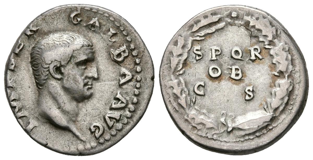 GALBA. Denario. Junio 68 d.C.-Enero 69 d.C. Roma. A/ Cabeza a derecha. IMP SER GALBA AVG. R/ SPQR OB C S en tres líneas dentro de corona de roble. RIC 167; BMCRE 34; RSC 287. Ar. 3,49g. MBC.