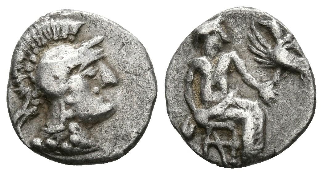 CILICIA, Ceca incierta. Obolo. Siglo IV a.C. A/ Baaltars sedente a derecha con águila descansando sobre mano extendida. R/ Cabeza con casco de Athena a derecha. Göktürk -; SNG France -; SNG Levante 244. Ar. 0,62g. MBC.