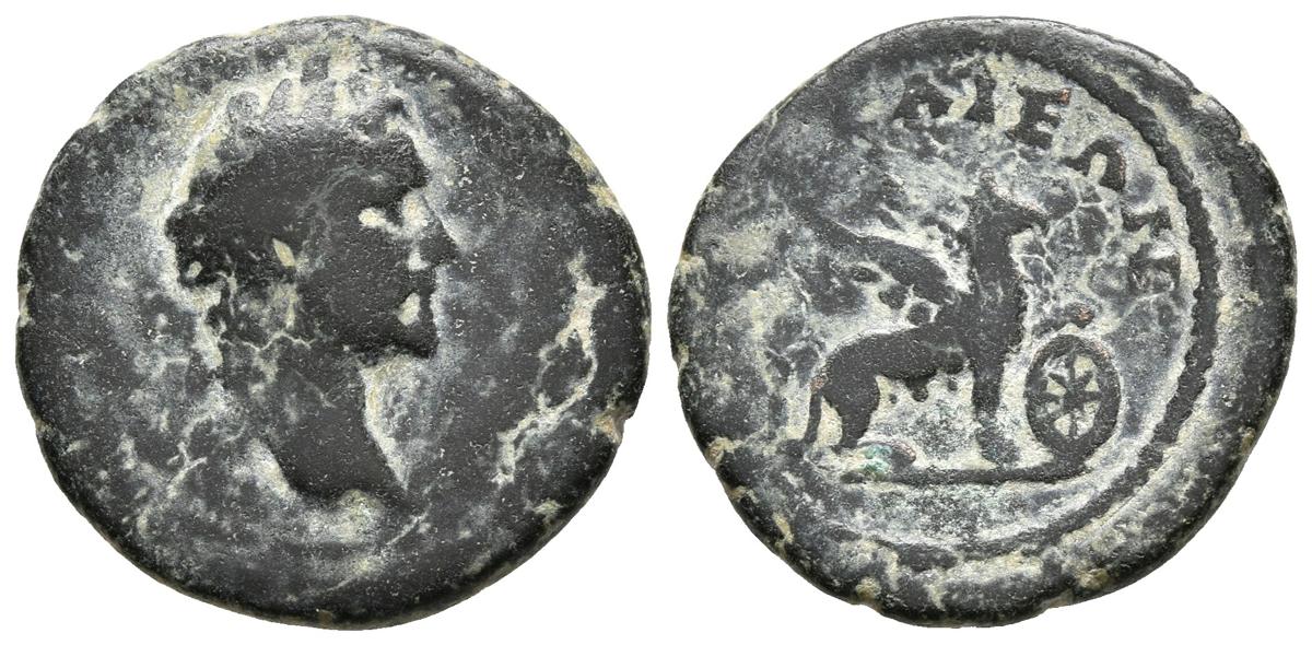 ANTONINO PIO. Ae20. 138-161 d.C. Bithynia, Nicaea. A/ Cabeza laureada a derecha. R/ Grifo sendente a derecha, apoyando su pata delantera sobre rueda. RPC IV online 5900.1=RG 115. Ae. 4,61g. BC/MBC-. Muy rara.