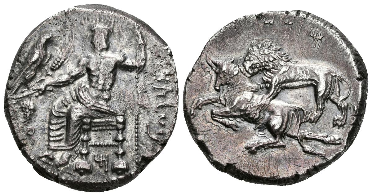 CILICIA, Tarsos. Estátera. 361-334 a.C. A/ Baaltars sedente a izquierda sosteniendo águila, espiga detrigo y racimo de uvas, cetro en la mano izquierda. Leyenda en arameo "BLTRZ" (Baaltars). R/ León atacando a un toro a izquierda. Leyenda en arameo "MZDI" (Mazaios). Casabonne series 2A; cf. SNG France 343. Ar. 10,81g. Bonito tono. MBC+/EBC-.