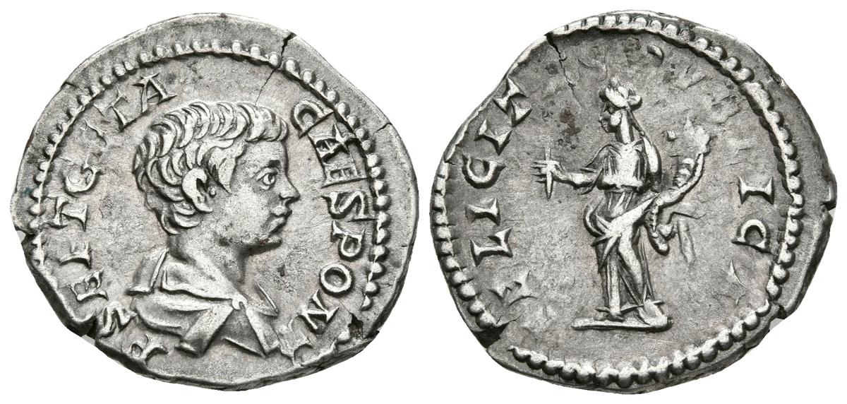 GETA. Denario. 200-202 d.C. Roma. A/ Busto drapeado con coraza a derecha. P SEPT GETA CAES PONT. R/ Felicitas estante a izquierda portando caduceo y cornucopia. FELICITAS AVGG. RIC 8; RSC 36. Ar. 2,96g. Pequeña grieta. MBC+.