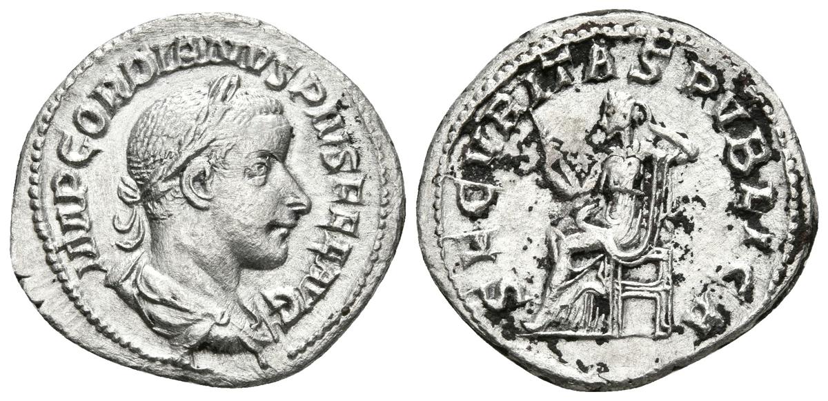 GORDIANO III. Denario. 238-244 d.C. Roma. A/ Busto laureado y drapeado con coraza a derecha. IMP GORDIANVS PIVS FEL AVG. R/ Securitas sedente a izquierda portando cetro y tocándose el pelo. SECVRITAS PVBLICA. RIC 130. Ar. 2,84g. Depósitos en reverso. MBC+.
