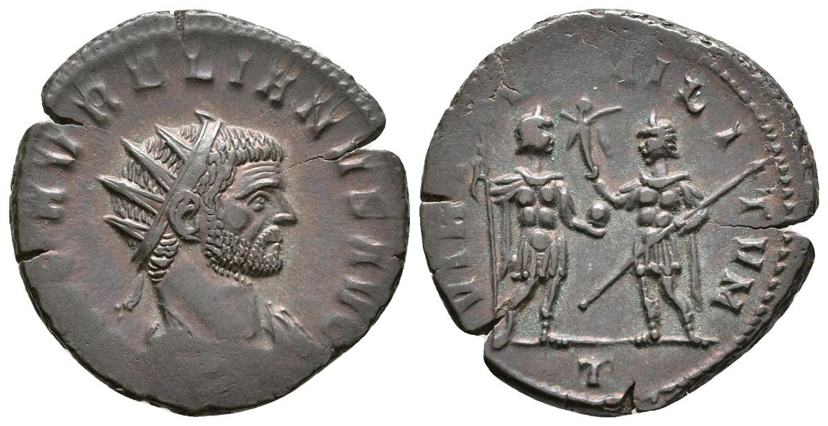AURELIANO. Antoniniano. 271 d.C. Milán. A/ Busto radiado con coraza a derecha. IMP AVRELIANVS AVG. R/ Soldado estante a izquierda portando lanza y Victoria, frente a él emperador estante a derecha portando lanza y globo. VIRTVS MILITVM, en exergo T. RIC V 147var. Ae. 4,01g. Vanos de acuñación. EBC.Ex Col. Dattari.