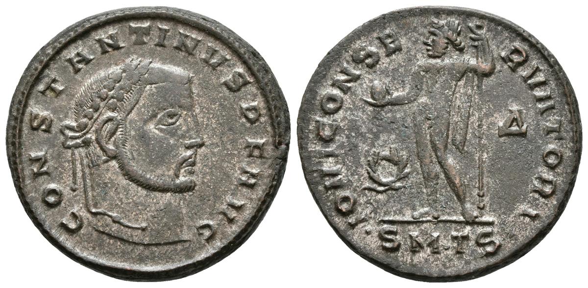 CONSTANTINO I. Follis. 312 d.C. Roma. A/ Busto Laureado a derecha. CONSTANTINVS P F AVG. R/ Júpiter de pie a izquierda con cetro y portando globo, delante corona laureado y detrás D, en exergo SMTS. IOVI CONSERVATORI. RIC 50a. Ae. 6,25g. MBC+.