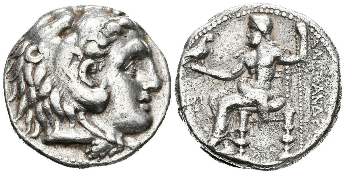 IMPERIO SELEUCIDA. Seleukos I Nikator. Acuñación a nombre de Alejandro III. Tetradracma. 311-305 a.C. Babilonia. A/ Cabeza de Herakles con tocado de piel de león a derecha. R/ Zeus sedente a izquierda portando águila y cetro, delante MI, detrás leyenda griega. SC 82.4a var; Price 3751 var; HGC 9. Ar. 19,96g. MBC+.