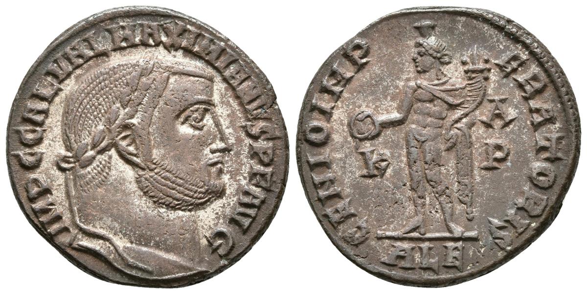 GALERIO. Follis. 310-313 d.C. Alejandría. A/ Busto laureado a derecha. IMP C GAL VAL MAXIMINVS P F AVG. R/ Genio estante a izquierda portando pátera y cornucopia, a ambos lados K-AP. GENIO IMPERATORIS, en exergo ALE. RIC VI 107c. Ae. 6,64g. MBC+.Ex Col. Dattari.