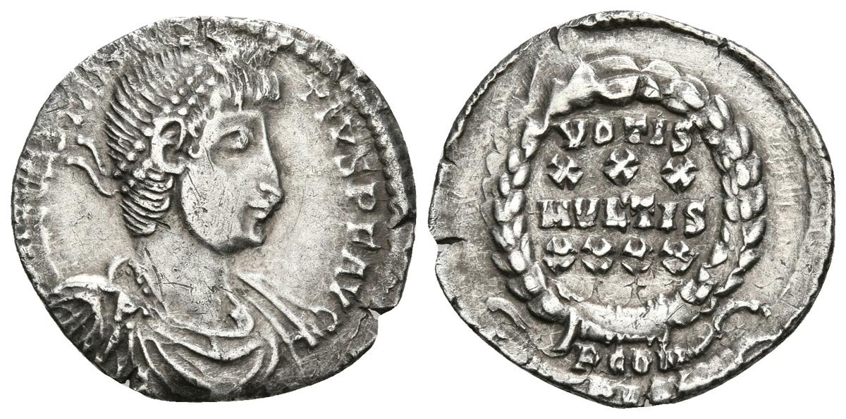 CONSTANCIO II. Siliqua. 360-363 d.C. Arelate. A/ Busto con diadema de perlas y drapeado con coraza a derecha. D N CONSTANTIVS P F AVG. R/ VOTIS XXX MVLTIS XXXX en cuatro líneas dentro de corona, en exergo PCON. RIC 291; RSC 342-3r. Ar. 1,89g. MBC/MBC+.* Procedente de "West Norfolk Hoard", tesoro encontrado en Octubre de 2015 en Inglaterra, puesto a la venta tras la autorización del Ministerio de Patrimonio Cultural (Ref: ID:NMS-102704).