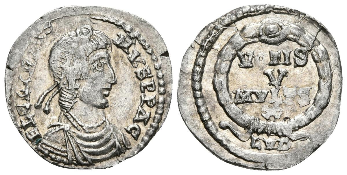 JULIANO II. Siliqua de Imitación. 360-363 d.C. Lugdunum. A/ Busto con diadema de perlas y drapeado con coraza a derecha. FL CL IVLIANVS P F AVG. R/ VOTIS V MVLTIS X en cuatro líneas dentro de corona, en exergo LV(G retrógrada). RIC 218; RSC 163. Ar. 1,71g. Conserva parte del brillo original. MBC+/EBC-.* Procedente de "West Norfolk Hoard", tesoro encontrado en Octubre de 2015 en Inglaterra, puesto a la venta tras la autorización del Ministerio de Patrimonio Cultural (Ref: ID:NMS-102704).
