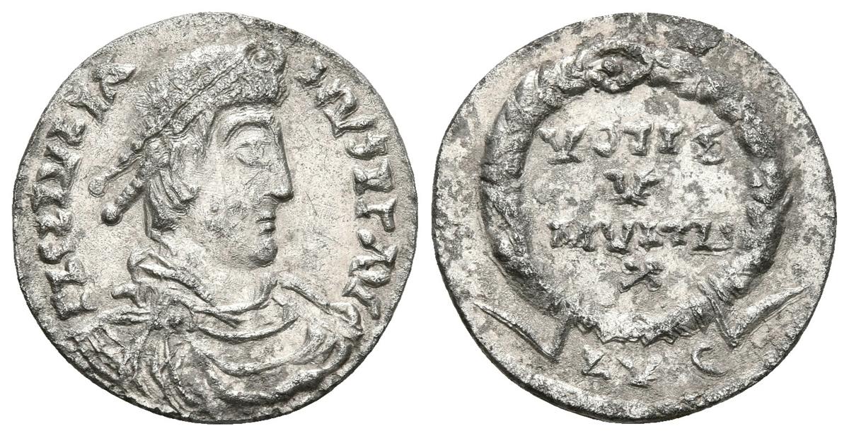 JULIANO II. Siliqua de Imitación. 360-363 d.C. Lugdunum. A/ Busto con diadema de perlas y drapeado con coraza a derecha. FL CL IVLIANVS P F AVG. R/ VOTIS V MVLTIS X en cuatro líneas dentro de corona, en exergo LVC. RIC 218 var; RSC 163. Ar. 1,37g. Conserva parte del brillo original. EBC-.* Procedente de "West Norfolk Hoard", tesoro encontrado en Octubre de 2015 en Inglaterra, puesto a la venta tras la autorización del Ministerio de Patrimonio Cultural (Ref: ID:NMS-102704).