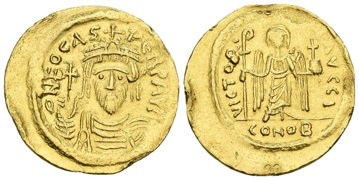 PHOCAS. Sólido. 603-607 d.C. Constantinopla. A/ Busto de frente con casco y coraza, portando globo crucífero. QN FOCAS PERP AVG. R/ Angel estante de frente portando gran bastón rematado por estaurograma y globo crucífero. VICTORIA AVGG I, en exergo CONOB. DOC 5j; MIB 7; Sear 618. Au. 4,46g. Probablemente desmontado de aro. MBC.
