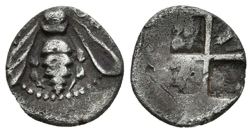 IONIA, Ephesos. Dióbolo. 500-420 a.C. A/ Abeja con alas ligeramente curvas, sobre ella decoración espiral. R/ Cuadripartito incuso. Karwiese Series VI, 2A; SNG Kayhan 124ã5. Ar. 0,73g. MBC. Rara.