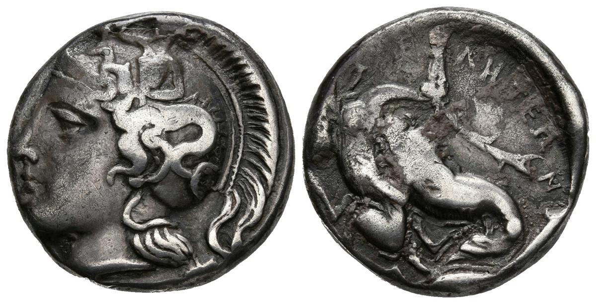 LUCANIA, Velia. Didracma. 435-400 a.C. A/ Cabeza de Athena a izquierda con casco ático con penacho y corona. R/ León a iquierda atacando a ciervo. HN Italy 1270; cf. 1590ff. Ar. 7,48g. MBC.