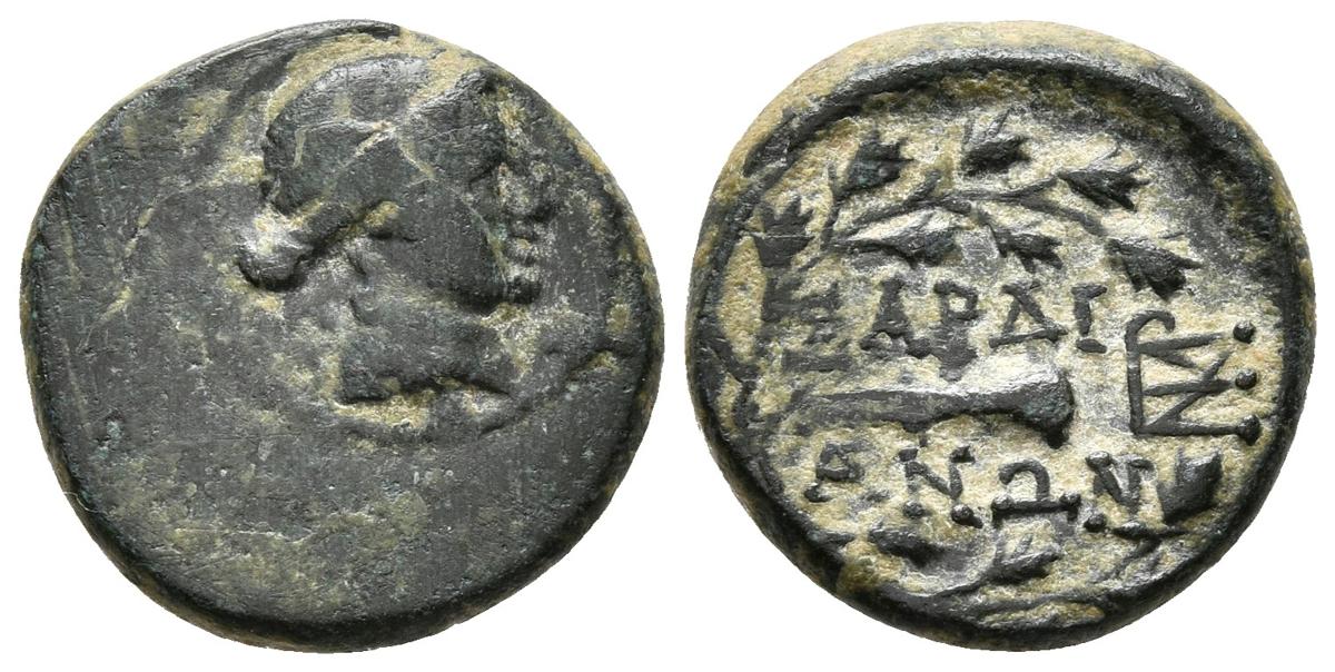 LYDIA, Sardes. Ae15. 133 a.C.-14 d.C. A/ Cabeza laureada de Apolo a derecha. R/ Clava a derecha dentro de corona de laurel, delante monograma. SNG Copenhagen 473. Ae. 3,72g. MBC-/MBC+.