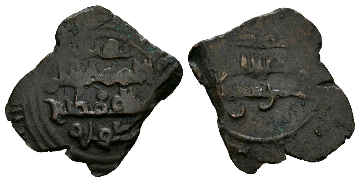 TAIFA DE ALPUENTE. Yumn Al-Dawla. Dirham. 421-434H. Al-Bunt (Alpuente). Prieto atribuye estas fracciones a Muhammad ben Abdallah, Señor de Alpuente entre 421-434H, que utilizó el título Yumn al-Dawla. Prieto 349. Ae. 0,56g. MBC. Muy escasa.