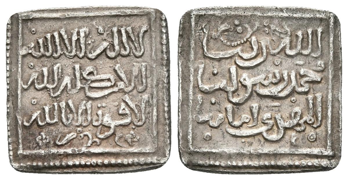 ALMOHADES. Dirham. Anónimo, citando a Al-Mahdi. Variante de decoración en ambas caras. Vives 2088; Hazard 1101. Ar. 1,51g. EBC.