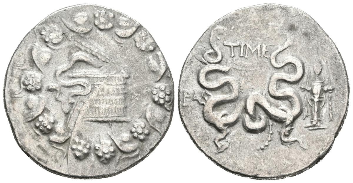 LYDIA, Tralleis. Cistophoro. 133 a.C. A/ Cista mística con una serpiente, rodeada de corona de yedra. R/ Arco con carcaj rodeado por dos serpientes, encima TIME, a la izquierda TRAA, a la derecha estatua de culto a Artemis Anaitis. SNG von Aulock 8287; SNG Copenhagen 661. Ar. 11,66g. MBC.