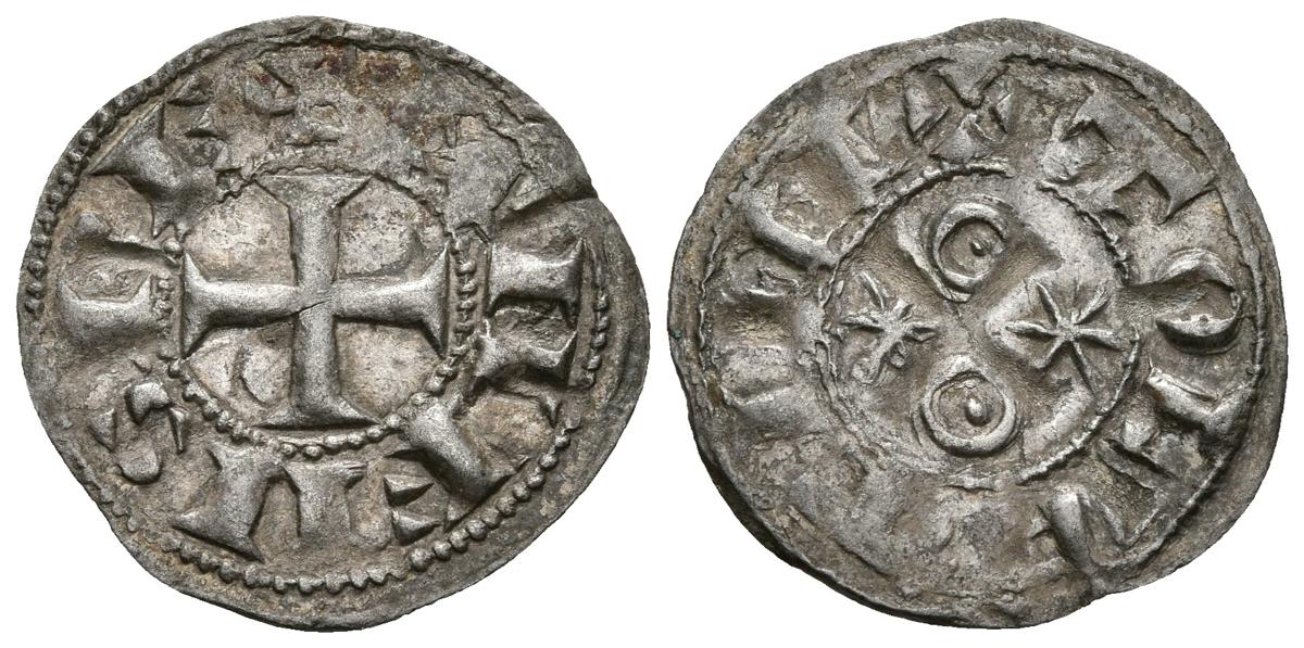 ALFONSO VI. Dinero. (1073-1109). Toledo. A/ Leyenda: + ANFVS RE. R/ Punto interior en los roeles. Mozo A6:7.8; AB 8.2. Ve. 0,56g. MBC+/MBC.