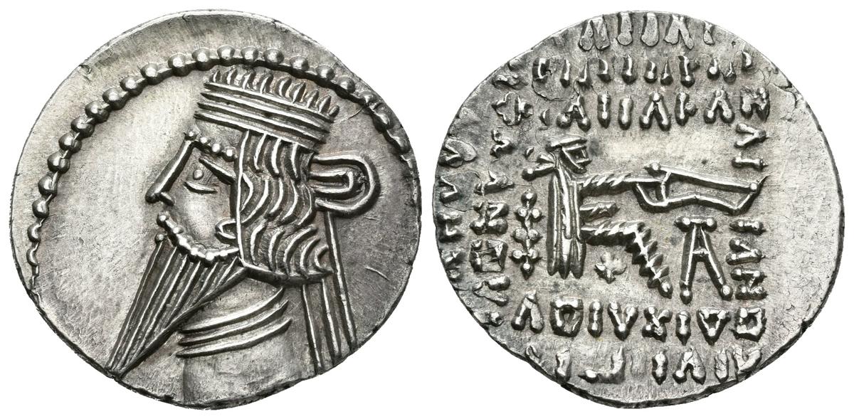 PAKOROS I. Dracma. 78-120 a.C. Ekbatana (Reino Parto). A/ Busto diademado con tiara y drapeado a izquierda. R/ Arquero sentado a derecha sosteniendo arco. Sellwood 78.3 (Vologases III). Ar. 3,77g. SC-. Magnífico ejemplar, rara así.