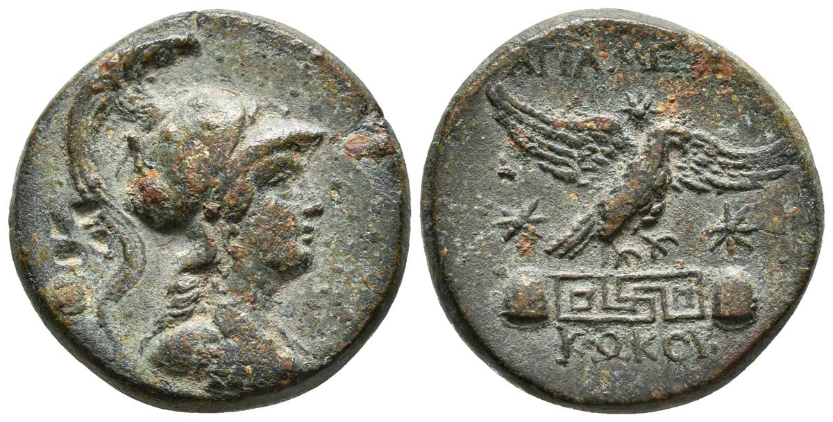 PHYRGIA, Apameia. AE22. 88-40 a.C. Kokos. A/ Busto de Atenea con casco a derercha. R/ Aguila posándose sobre altar de Meandro, a ambos lados gorros de Dioscuros con estrellas sobre ellos. SNG Copenhagen 161-2; BMC 78-82; HGC 7, 670. Ae. 9,86g. Contramarca en anverso. MBC-/MBC.