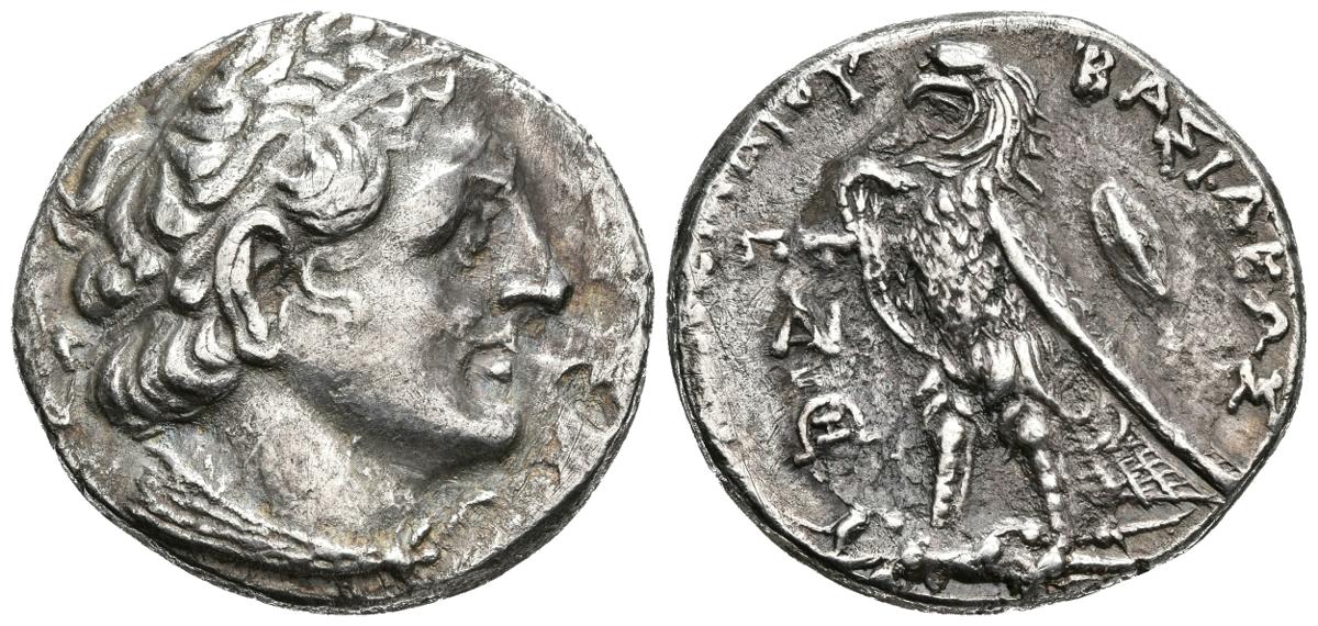 PTOLOMEO II Philadelphos. Tetradracma. 285-260 a.C. Alejandría. A/ Cabeza diademada de Ptolomeo I a derecha, vistiendo aegis. R/ Aguila con alas plegadas en pie a izquierda con haz de rayos en sus garras, a la derecha escudo y a la izquierda dos monogramas. Svoronos 544. Ar. 13,24g. MBC/MBC+.