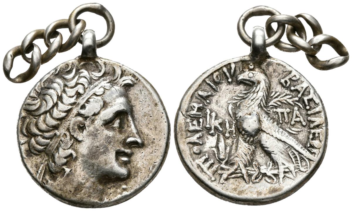 PTOLOMEO XII. Tetradracma. Año 28, 54-53 a.C. Alejandría. A/ Cabeza diademada de Ptolomeo I a derecha. R/ Aguila a izquierda con haz de rayos entre sus garras, a la izquierda tocado de Isis y fecha LKH, a la dercecha TTA. Svoronos 1837; SNG Cop. 395. Ar. 15,28g. Sirvió como joya, conserva anilla con cadena. MBC+.