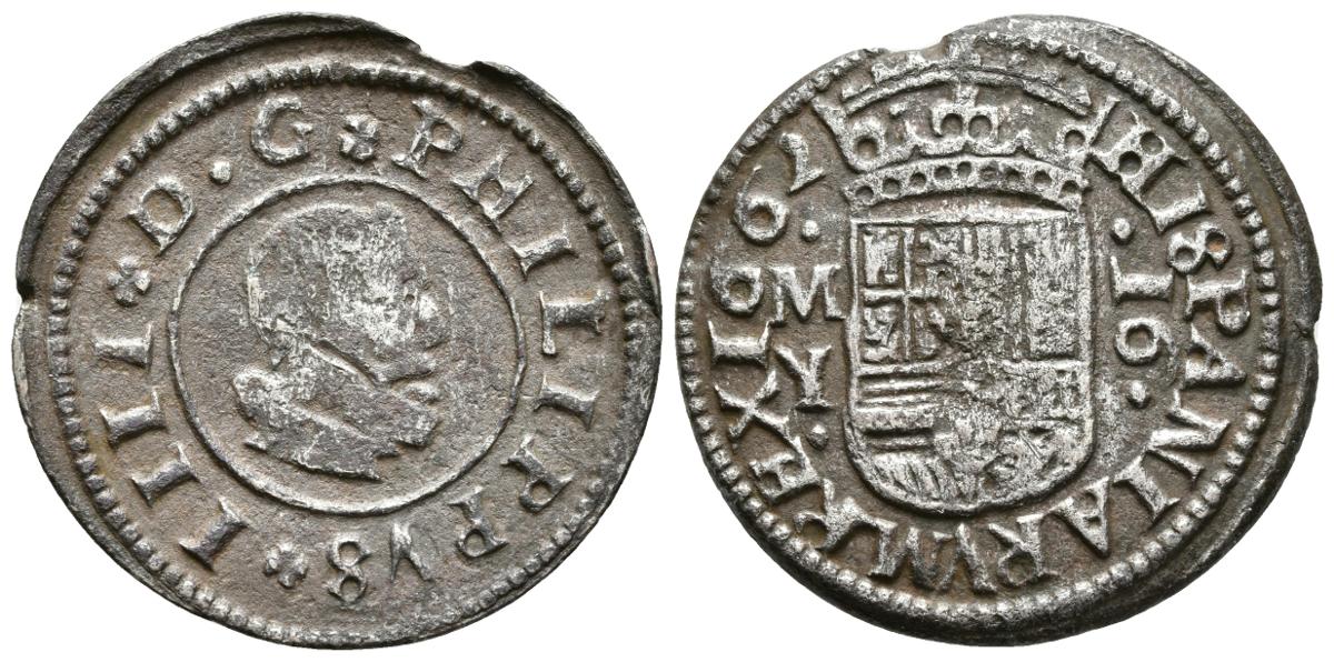 FELIPE IV. 16 Maravedís. 1662. Madrid Y. Valor girado y entre puntos. Cal-1396; J.S. M-No cita. Ae. 3,91g. Conserva parte del plateado original. MBC-/MBC. Escasa.