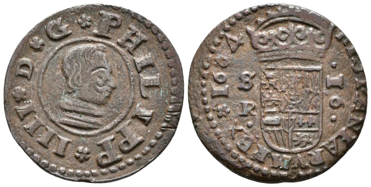 FELIPE IV. 16 Maravedís. 1664. Sevilla R. Nombre del rey PHILIPP. Cal-1570; J.S. M-621. Ae. 4,45g. MBC+. Escasa.