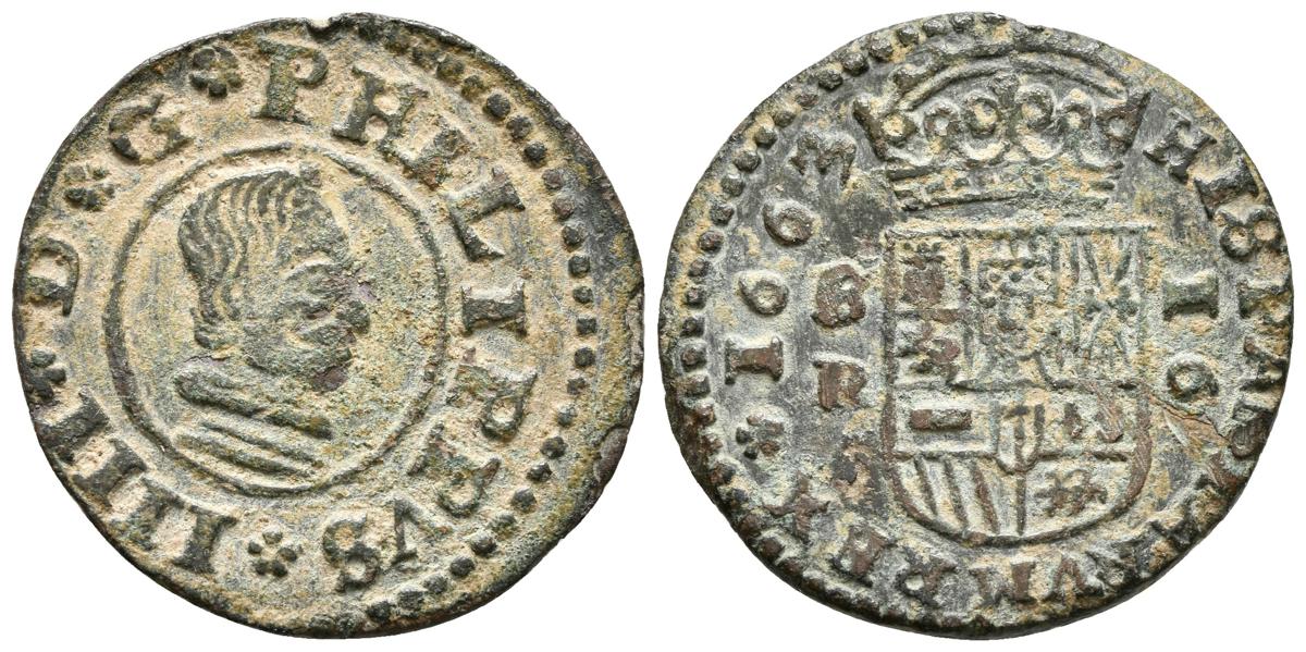 FELIPE IV. 16 Maravedís. 1663. Sevilla R. Sin puntos acotando ceca y ensayador ni el valor. Cal-1568; J.S. M-No cita. Ae. 4,26g. MBC+. Escasa.