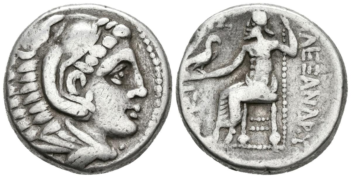 REINO DE MACEDONIA. Philippo III Arrhidaeus, en nombre de Alejandro III. Tetradracma. 323-317 a.C. Amphipolis. A/ Cabeza de Herakles a derecha, con tocado de piel de león. R/ Zeus Aetophoros sedente a izquierda, sosteniendo cetro y águila. Price 112; Müller 854. Ar. 16,69g. MBC/MBC-.