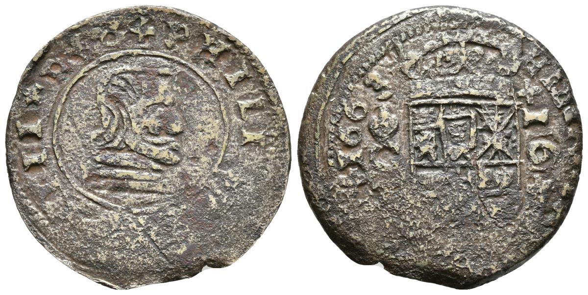 FELIPE IV. 16 Maravedís. 1663. Córdoba T. Falsa de época muy curiosa. Cal-1285; J.S. pág. 384. ¿Latón?. 4,54g. MBC-.