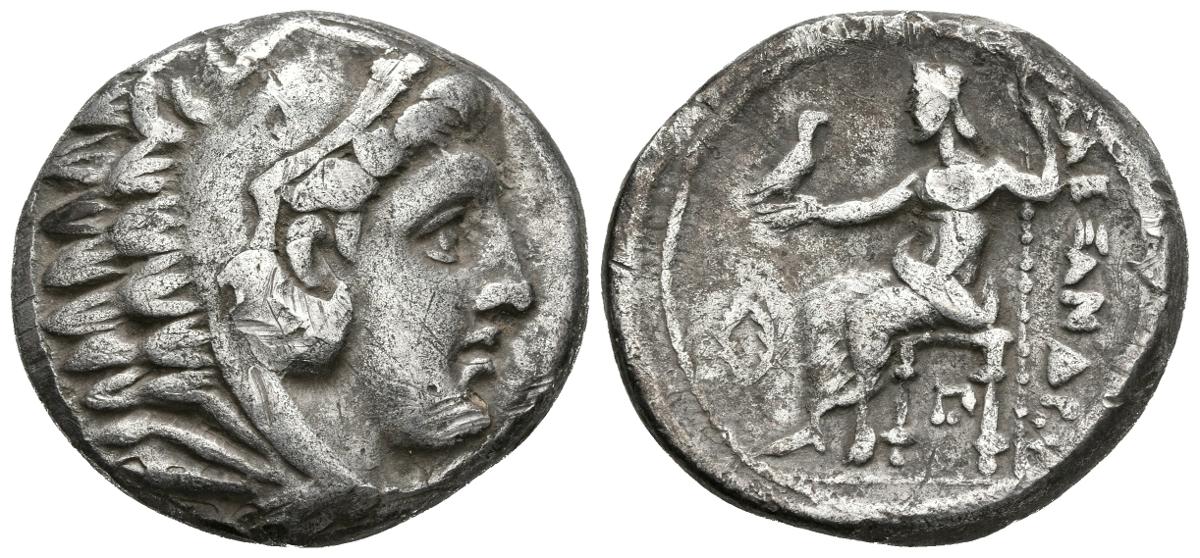 REINO DE MACEDONIA. Alejandro III. Tetradracma. 320-317 a.C. Amphipolis. A/ Cabeza de Herakles a derecha, con tocado de piel de león. R/ Zeus Aetophoros sedente a izquierda, sosteniendo cetro y águila, delante corona, en el trono Pi. Price 132; Müller 549. Ar. 16,58g. Golpecito en anverso. MBC/MBC-.