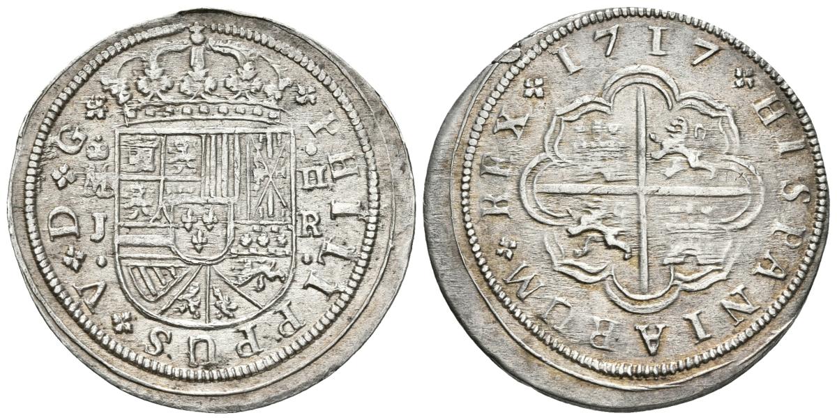 FELIPE V. 2 Reales. 1717. Madrid J. Error rectificado en la leyenda PHILIPPUS, letra L rectificada sobre I. Cal-1244. Ar. 5,71g. EBC/EBC+. Rara.