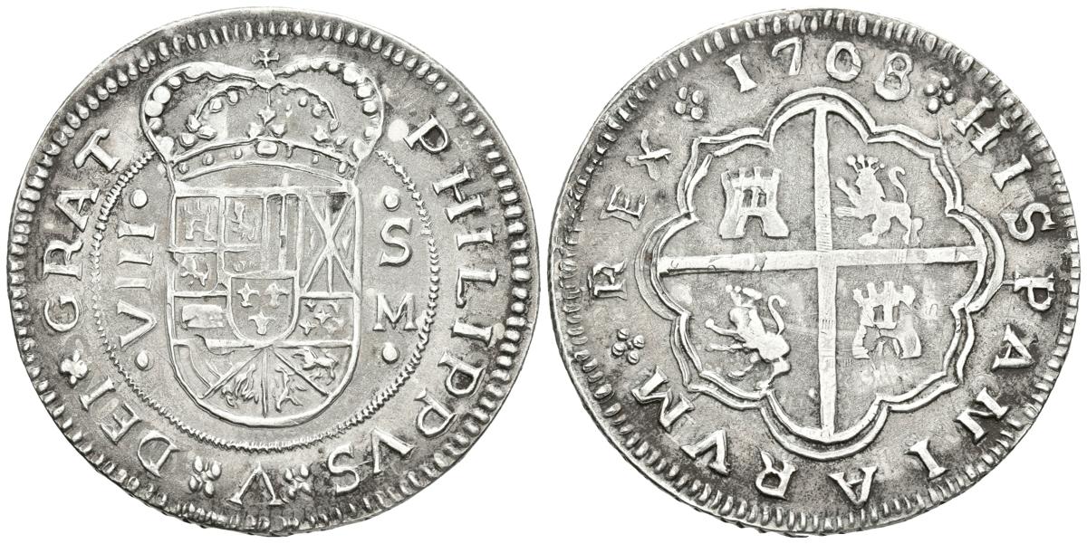 FELIPE V. 8 Reales. 1708. Sevilla M. Cal-928. Ar. 24,31g. Curiosa copia acuñada sobre 5 Pesetas de Alfonso XIII. MBC+.