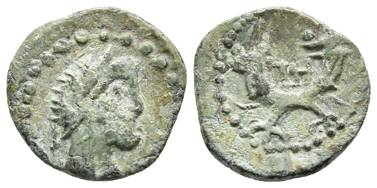 REINO NABATEO. Aretas IV. Ae13. 9 a.C. - 40 d.C. Petra. A/ Cabeza laureda a derecha. R/ Dos cornucopias, entre ellas en arameo Resh y Heth. Meshorer, Nabataea 67. Ae. 1,31g. MBC.