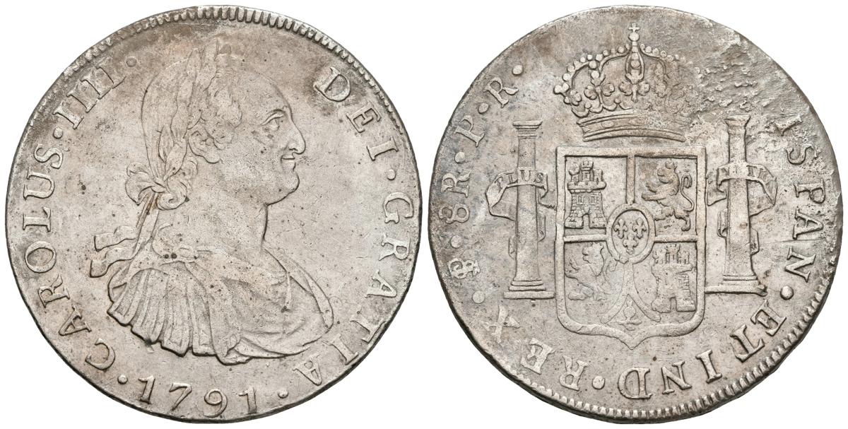 CARLOS IV. 8 Reales. (Ar. 26,45g/41mm). 1791. Potosí PR. (Cal-712). MBC. Vano de acuñación. Escasa.