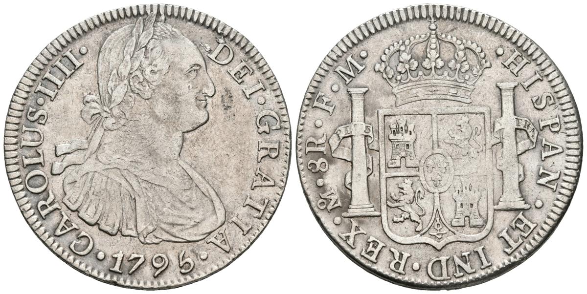 CARLOS IV. 8 Reales. (Ar. 26,99g/39mm). 1795. México FM. (Cal-689). MBC+. Excesos de metal en anverso y acuñación desplazada.