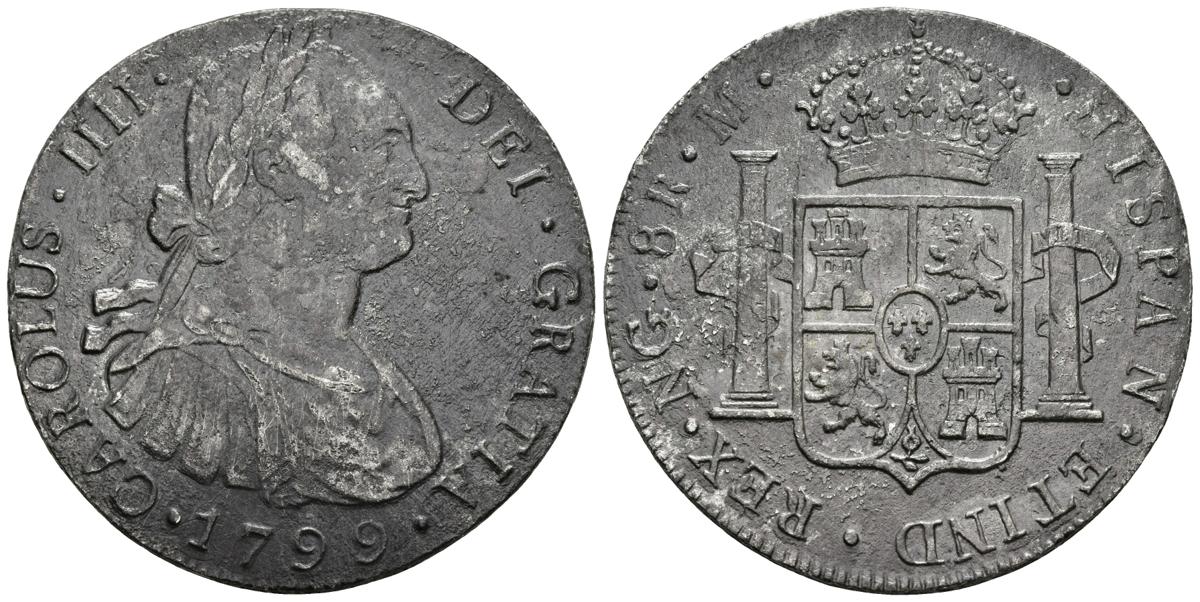 CARLOS IV. 8 Reales. 1799. Guatemala M. Cal-630. Ar. 25,42g. Oxidaciones marinas. MBC-.