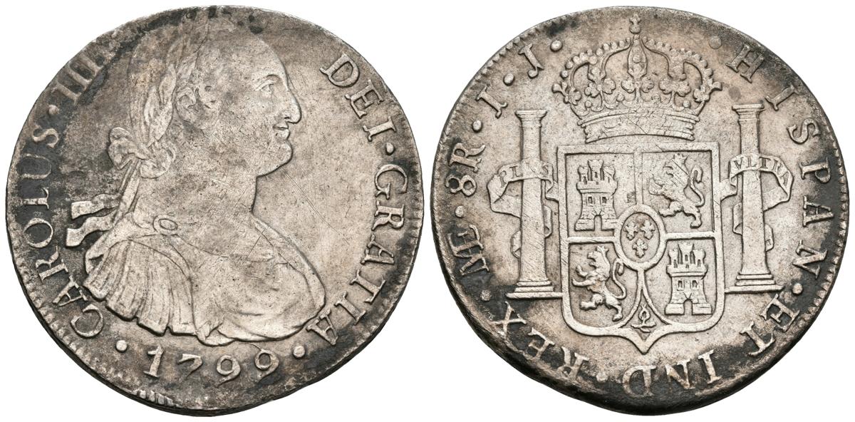 CARLOS IV. 8 Reales. (Ar. 26,00g/38mm). 1799. Lima IJ. (Cal-654). MBC+. Oxidaciones y acuñación desplazada. Rayas.