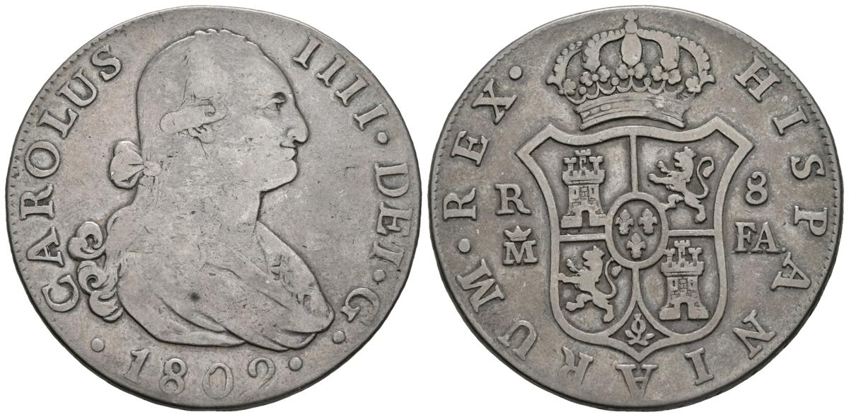 CARLOS IV. 8 Reales. 1802. Madrid FA. Cal-673. Ar. 26,60g. Pátina. BC+/MBC-.