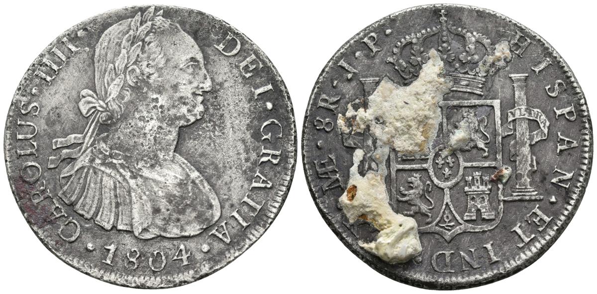 CARLOS IV. 8 Reales. 1804. Lima JP. Cal-661. Ar. 25,80g. Presenta oxidaciones marinas, así como algunas conchas y restos de corales en su reverso. MBC-.