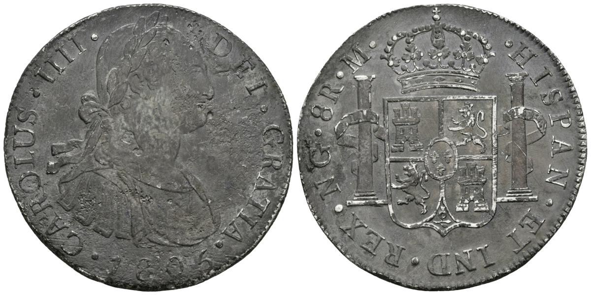 CARLOS IV. 8 Reales. 1805. Guatemala M. Cal-637. Ar. 26,64g. Oxidaciones marinas. MBC-/MBC+. Escasa.