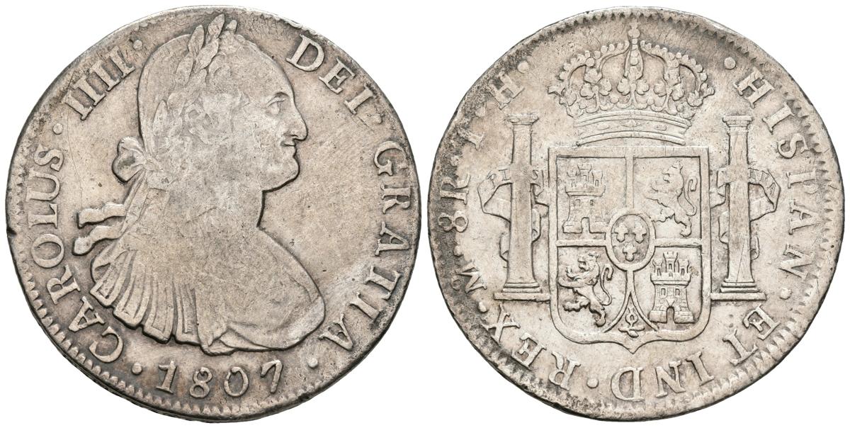 CARLOS IV. 8 Reales. (Ar. 26,74g/39mm). 1807. México TH. (Cal-707). MBC+. Vano de acuñación y oxidaciones. Marquitas.