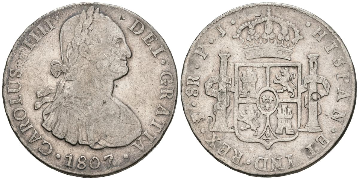 CARLOS IV. 8 Reales. (Ar. 26,69g/39mm). 1807. Potosí PJ. (Cal-731). MBC. Contramarcas.