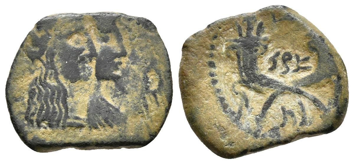 REINO NABATEO. Malichos con Shaqilath I. Ae15. 40-70 d.C. Petra. A/ Bustos drapeados de Malichos junto a Shaqilah a derecha. R/ Doble cornucopia. Meshorer, Nabatea, 140a. Ae. 1,90g. MBC.