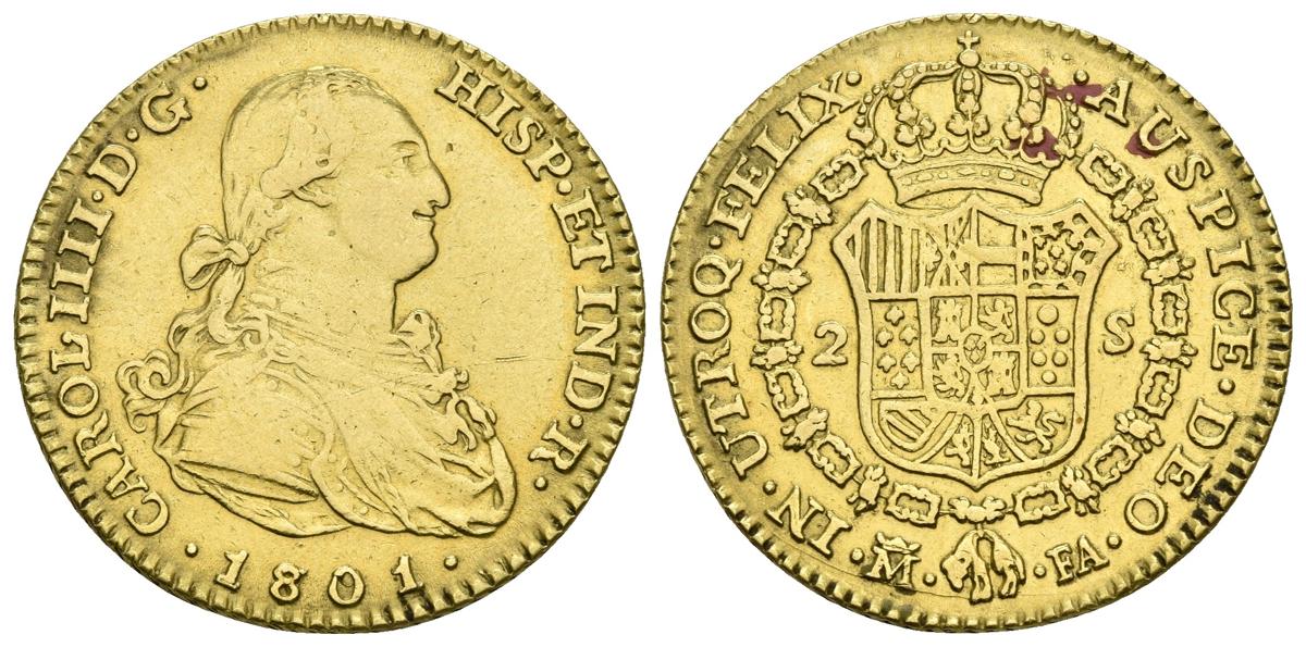 CARLOS IV. 2 Escudos. (Au. 6,73g/22mm). 1801. Madrid FA. (Cal-342). BC+/MBC-. Limpiada.