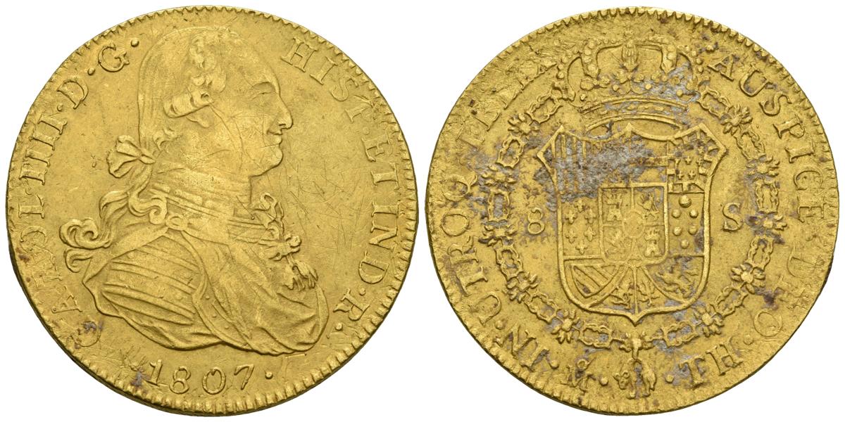 CARLOS IV. 8 Escudos. 1807. México TH. Cal-63; Cal. Onza 1044. Au. 26,90g. Incrustaciones marinas y rayas por limpieza. MBC.