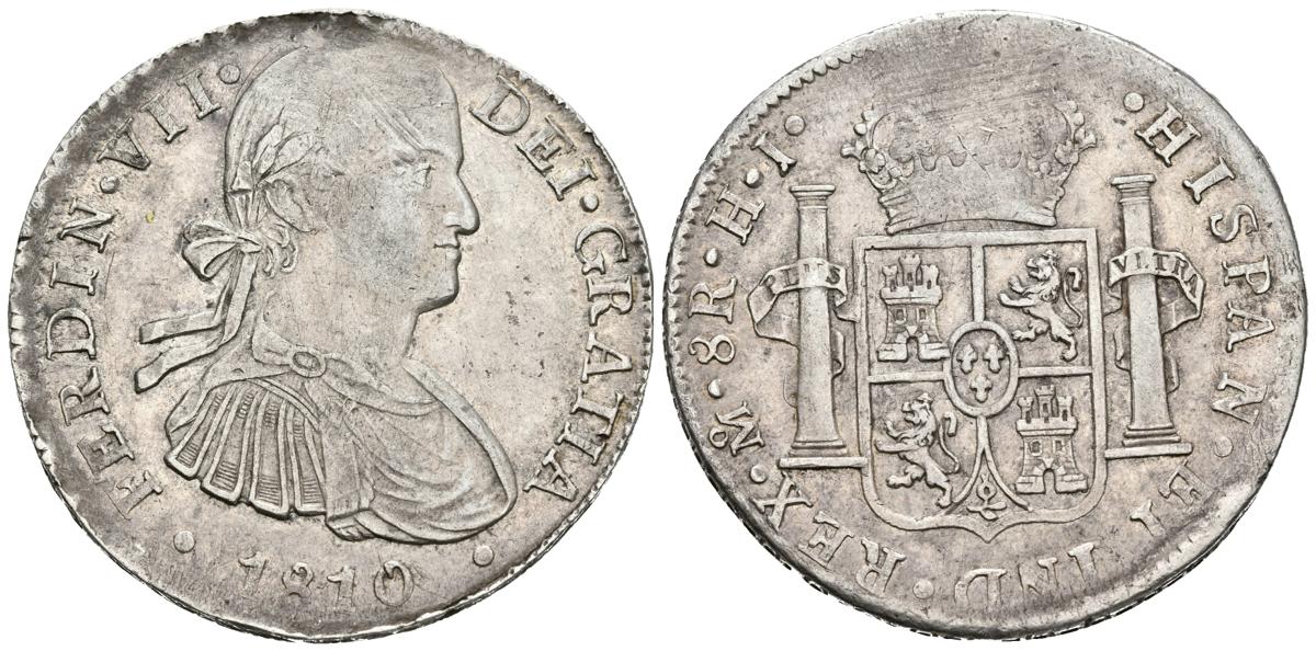 FERNANDO VII. 8 Reales. (Ar. 26,93g/39mm). 1810. México HJ. (Cal-543). MBC+. Rayas de ajuste y vanos de acuñación.