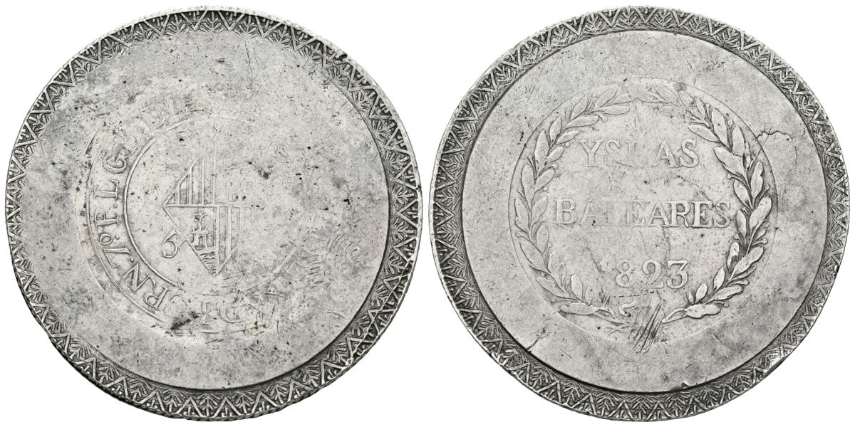 FERNANDO VII. 5 Pesetas. 1823. Mallorca. REY D. ESPAN. E YND. Cal-533. Ar. 27,00g. MBC-.